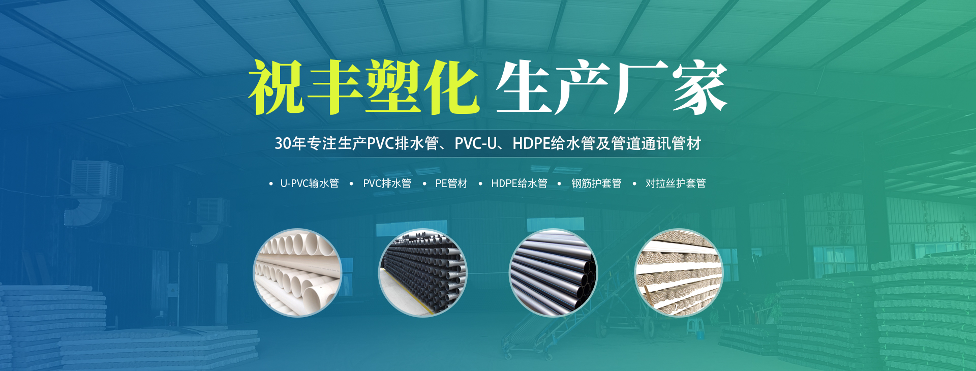 安陽市祝豐塑化有限公司坐落在滑縣工業(yè)園區(qū),東臨大廣高速,西臨京珠高速,是鄭州、鶴壁、安陽、濮陽四個城市的輸紐,交通便利、環(huán)境優(yōu)美。       公司始建于八十年代,經(jīng)過二十余年的艱辛創(chuàng)業(yè),規(guī)模不斷壯大,由十多萬元資產(chǎn)的小廠,發(fā)展到現(xiàn)占地面積達(dá)一萬多平,建筑面積一萬平,資產(chǎn)2000多萬元管材生產(chǎn)企業(yè)。公司生產(chǎn)PVC-U、PVC排水管、HDPE給水管、鋼筋護(hù)套管管道通訊管材等產(chǎn)品,廣泛用于農(nóng)田節(jié)水、高山引水、人畜用水、建筑、電力通訊等多種用途,品種齊全。為了滿足用戶需求,可承攬各種給水、節(jié)水、灌溉工程。“祝豐塑化”憑借強(qiáng)勁的實力,優(yōu)良的管理水平。“以質(zhì)量求生存,以信譽(yù)求發(fā)展”的原則全力以赴和大家共同塑造美好未來。..